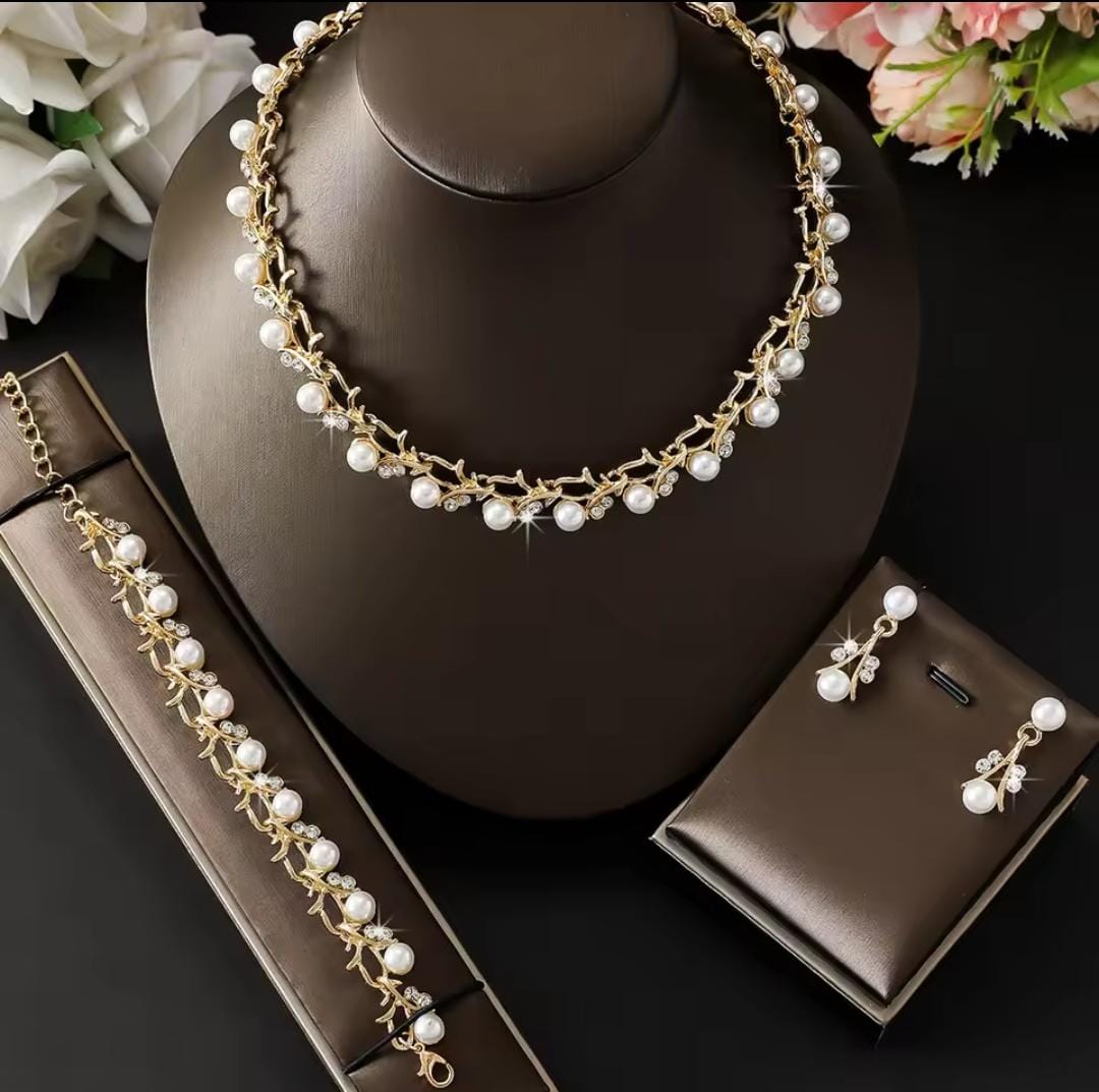 Each set includes a captivating choker necklace, a graceful matching bracelet, and a pair of charming stud earrings. The intricate design features delicate branches or leaves adorned with an array of luminous faux pearls, beautifully complemented by dazzling clear rhinestones that catch the light with every movement. The high-quality metal alloy ensures durability and a luxurious finish.