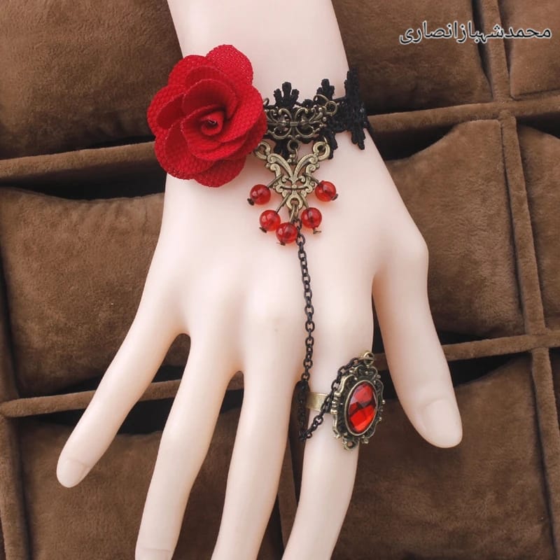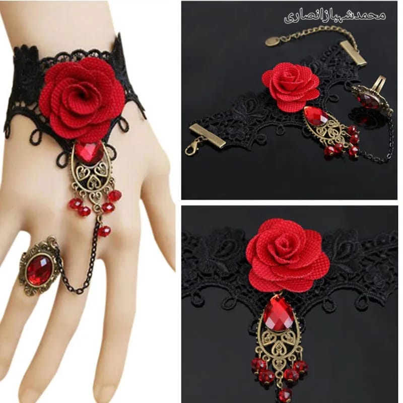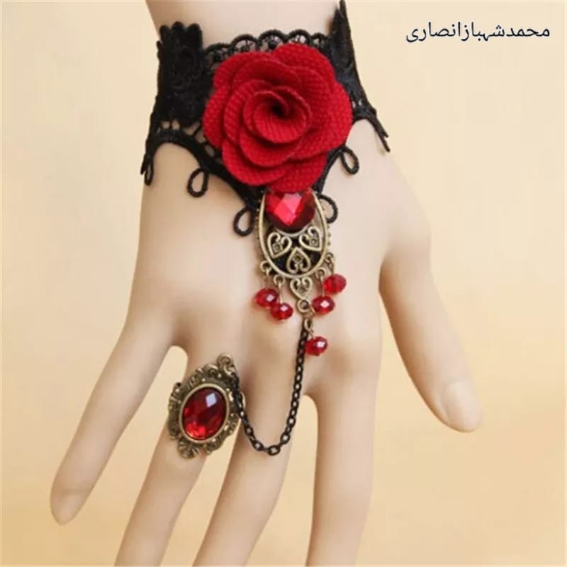 - Gothic Rose & Gemstone: Dive into a world of dramatic charm with this ornate variation. It showcases a wider, intricately patterned black lace cuff adorned with a striking red fabric rose. Dangling red beads and an antique gold-tone filigree piece add richness, connecting to an adjustable ring featuring a vibrant red gemstone. This style is perfect for making a bold, romantic statement.