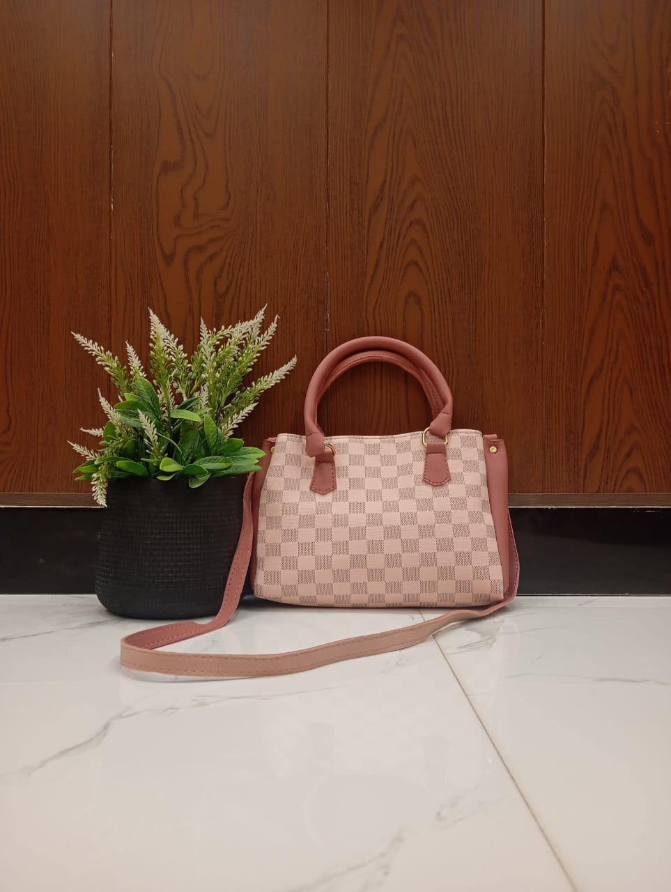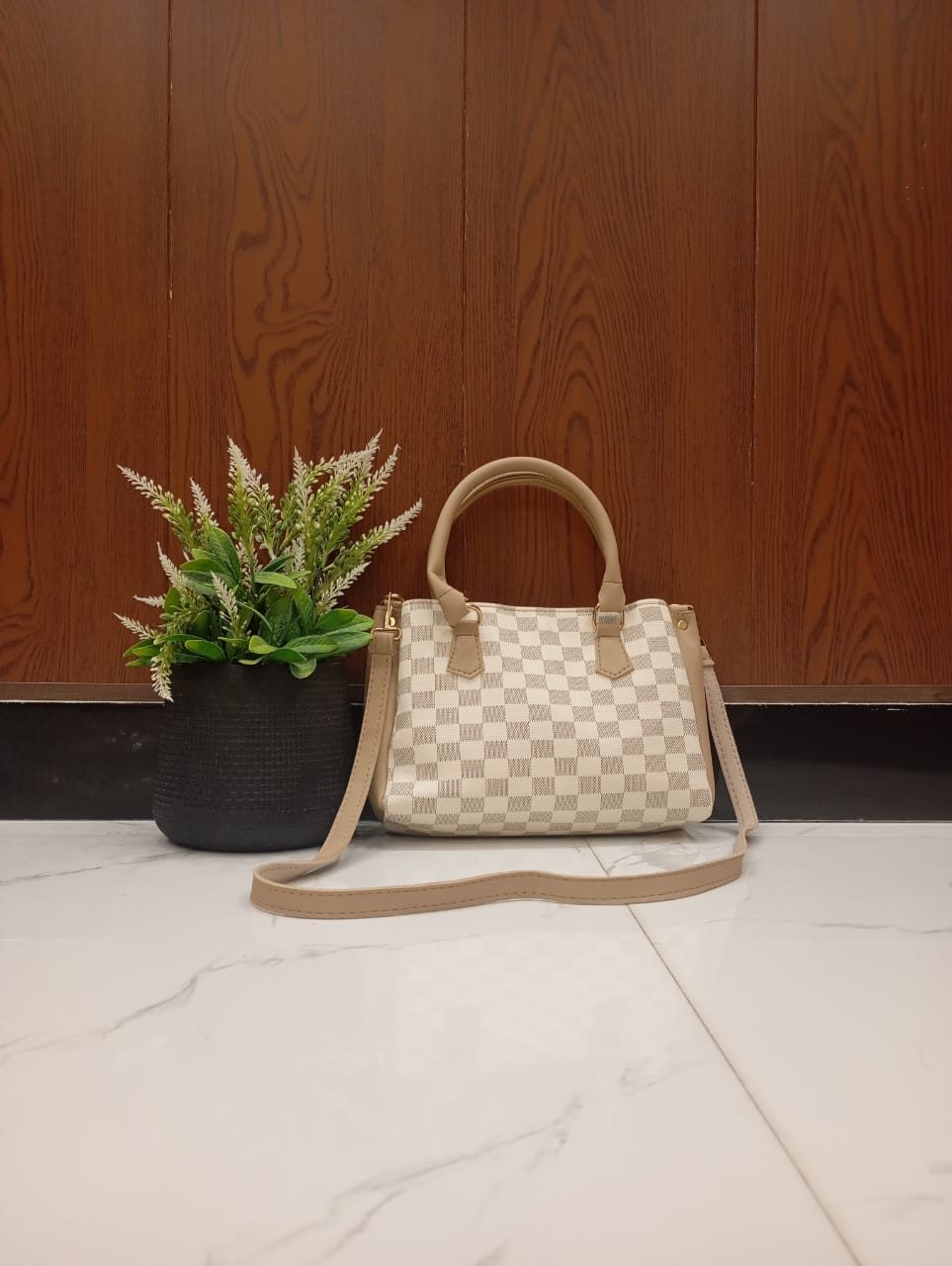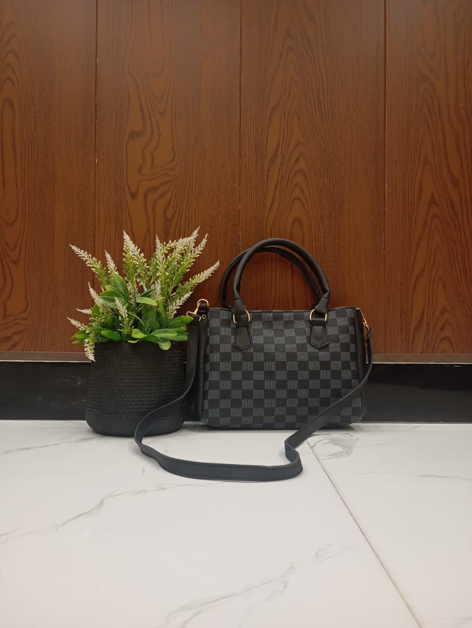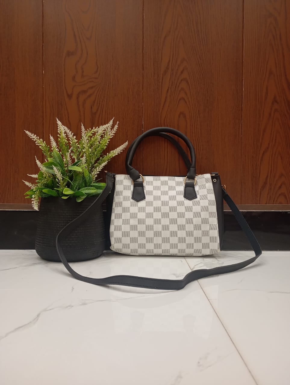 The bag’s distinguishing checkered pattern offers a stylish and unique appeal, setting it apart from ordinary handbags. Its compact yet surprisingly spacious interior includes an inside pocket, perfect for keeping your phone, keys, or lipstick organized and easily accessible. Designed for practicality, it’s incredibly easy to carry, whether you prefer to hold it by its sturdy top handles or wear it as a crossbody with the comfortable, adjustable shoulder strap.